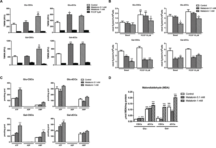 Figure 2: Melatonin altered mitochondrial membrane potential, oxygen consumption and ATP production in P19 cells. A. Accumulation of the potentiometric dye tetramethylrhodamine methyl ester (TMRM) was measured by flow cytometry in all experimental groups: stem (CSCs) and differentiated (dCCs) P19 cells, growing in glucose (Glu) and in modified galactose (Gal)-containing media, and treated with 0.1 and 1 mM melatonin during 72 hours. Data are shown as relative fluorescence units (RFU) that represent the mean average of geometric mean values ± SEM from at least three independent experiments. Carbonyl cyanide 4-(trifluoromethoxy)phenylhydrazone (FCCP) (2 μM) was used as negative control. Statistical comparisons: * vs. control; # vs. 0.1 mM melatonin. B. Oxygen consumption displayed as nmol of O2 per minute and per 106 cells was decreased after the treatment with melatonin in Glu-dCCs, Gal-CSCs and Gal-dCCs. Ten μM FCCP was added to test maximal respiration. Data are means ± SEM from at least three independent experiments. Statistical comparisons: * vs. control; # vs. 0.1 mM melatonin; † vs. basal. C. ATP, ADP and AMP measurements obtained by high-performance liquid cromatography and expressed as pmol per mg of protein indicated an increased ATP production after 72 hours of treatment with 1 mM melatonin, particularly in cells cultured in galactose medium. Data are means ± SEM from n = 6 experiments. D. Measurement of malondialdehyde (MDA) by high-performance liquid cromatography in the four groups of P19 cells revealed an increased lipid peroxidation after 72 hours of treatment with 1 mM melatonin, especially in cells cultured in modified galactose medium. Data are means ± SEM for n = 6 experiments. Statistical comparisons: * vs. control; # vs. 0.1 mM melatonin; a vs. Glu-CSCs; b vs. Gal-CSCs; c vs. Glu-dCCs. The number of symbols marks the level of statistical significance: one for p < 0.05, two for p < 0.01, and three for p < 0.001.