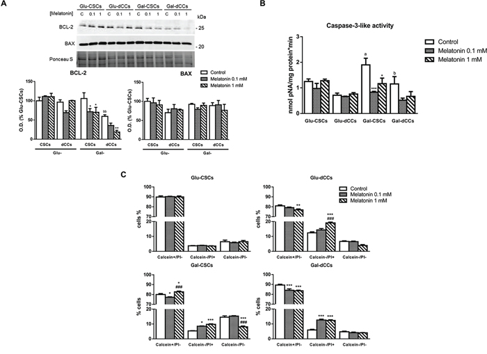 Figure 3: Melatonin induced caspase-3-independent cell death in P19 cells presenting oxidative metabolism. A. Protein levels of BCL-2 and BAX revealed no changes in BAX content but evident alterations in BCL-2 especially after treating P19 cells cultured in galactose with melatonin. Treatments: control (C), melatonin 0.1 mM (0.1), and melatonin 1 mM (1). Bar charts show means of optical density (O.D.) ± SEM expressed as percentage of Glu-CSCs, from at least three separate immunoblots. B. Caspase-3-like activity determined in the four types of P19 cells: P19 stem (CSCs) and differentiated (dCCs) cells, grown in glucose (Glu) and modified galactose media (Gal), using DEVD linked to p-nitroaniline (pNA) was not induced by the treatment with melatonin during 72 hours. Data are expressed as means (nmol pNA per minute and mg protein) ± SEM from at least three independent experiments. C. However, live/dead assay with calcein-AM and propidium iodide (PI) showed a higher percentage of dead cells (calcein-/PI+) in melatonin-treated cells which present a higher oxidative metabolism (Glu-dCCs, Gal-CSCs and Gal-dCCs). Data are expressed as percentage of viable cells (calcein+/PI-), dead cells (calcein-/PI+), and cell debris (calcein-/PI-) ± SEM from at least three independent experiments. Statistical comparisons: * vs. control; # vs. 0.1 mM melatonin; a vs. Glu-CSCs; b vs. Gal-CSCs. The number of symbols marks the level of statistical significance: one for p < 0.05, two for p < 0.01, and three for p < 0.001.