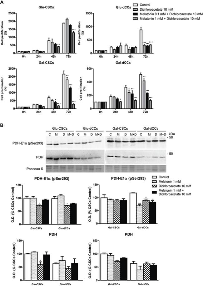 Melatonin (M5250, Sigma) was always freshly dissolved in ethanol and dichloroacetate (347795, Sigma) in water. If not indicated otherwise, twenty-four hours after seeding, P19 CSCs and dCCs grown in both culture media were exposed to 0.1 mM and 1 mM melatonin alone or in combination with 10 mM dichloroacetate (347795, Sigma) during 72 hours. Controls were always treated with an equal amount of vehicle (less than 0.95% ethanol).