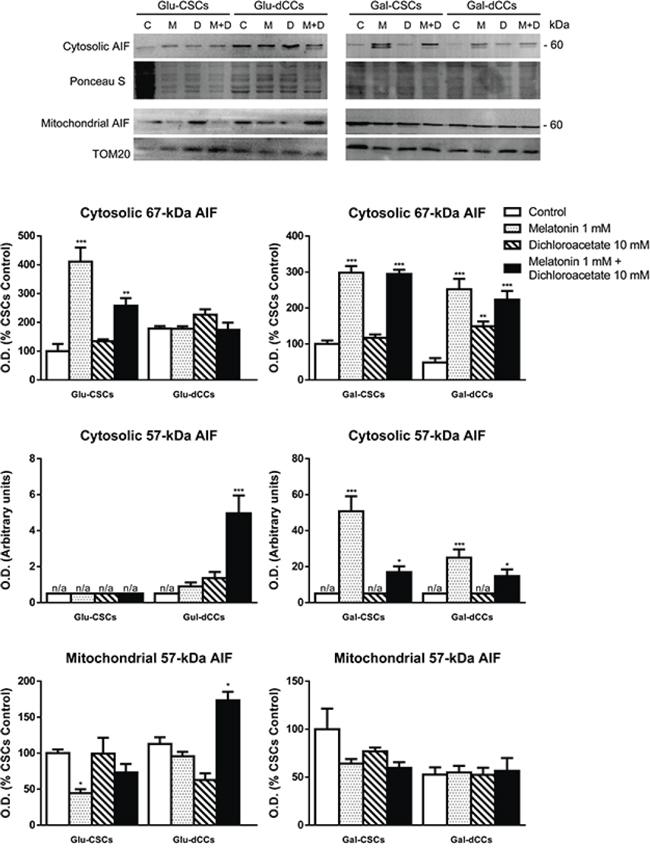 Figure 5: Representative immunoblot images for apoptosis-inducing factor (AIF) in cytosolic and mitochondrial extracts from P19 stem (CSCs) and differentiated (dCCs) cells, grown in glucose (Glu) and galactose (Gal) media, show a higher cytosolic localization of ~57 kDa form of AIF in cells grown in galactose media, treated with melatonin, alone or in combination with dichloroacetate. Treatments: control (C), melatonin 1 mM (M), dichloroacetate 10 mM (D), and melatonin 1 mM + dichloroacetate 10 mM (M+D). Ponceau S and TOM20 were used to normalize sample loading in cytosolic and mitochondrial extracts, respectively. Bar charts show means of normalized optical density (O.D.) ± SEM, from at least three separate immunoblots. Statistical comparisons: *p < 0.05; **p < 0.01; ***p < 0.001 vs. control. n/a: no band detected (O.D. = 0).