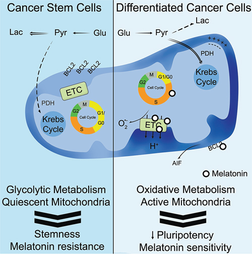 Figure 6: Schematic representation summarizing the proposed role of melatonin in cancer stem cells. Our hypothesis ascribes an anti-tumor effect for melatonin only in differentiated cancer cells with an active oxidative metabolism, triggering a type of mitochondrial-mediated cell death which is likely to be characterized by an arrest at S-phase, reduction of the mitochondrial electron transport chain (ETC), generation of reactive oxygen species, BCL-2 down-regulation and AIF release. Thus, the treatment with melatonin and the stimulation of mitochondrial metabolism constitute promising strategies against resistant cancer stem cells.