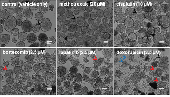 Figure 3: FDA-approved anticancer drugs screened using spheroidsMARY-X. Methotrexate and Cisplatin show no response retaining well-circumscribed spheroid edges (black arrows) identical to the control. Low to moderate with slightly distorted spheroid edges (red arrows) response is seen in bortezomib and lapatinib, whereas doxorubicin displays a mixed response where distorted (red arrows) and well-circumscribed spheroids (black arrows) coexist as well as a single cell population (blue arrows) a sign of complete response. (bar 50 μm)