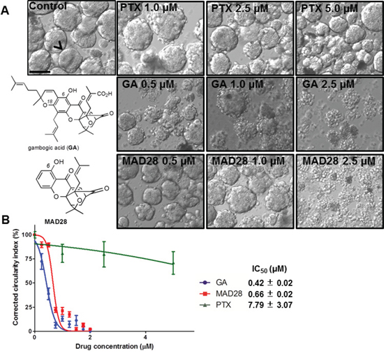 Figure 5: Dose response curve rendering IC50 values of drugs using spontaneously-forming spheroidsMARY-X drug screen. (A) Gambogic acid (GA) and MAD28 display ‘complete’ response as there is total dissolution of the formerly intact spheroid with well-circumscribed edges to the single cell state (B) Dissolution indices are determined through image analysis and used to construct a dose-response curve and subsequent IC50 of drugs that displayed response as compared to the standard of care of metastatic breast cancer (i.e. Paclitaxel). (bar 100 μm)