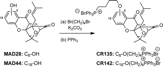 The second library was composed of two natural products of diverse chemical structure and distinctly different cellular modes of action. Taxol (paclitaxel, PTX) is a diterpene that inhibits mitosis by binding to cellular microtubules and is used for the treatment of lung, ovarian and breast cancer [65]. Gambogic acid (GA) is a natural product, derived from traditional ethnomedicine, currently in phase II clinical trials in China as an anticancer agent against non-small cell lung, colon and renal cancers [66, 67]. Compounds MAD28 and MAD44 are synthetic analogues of GA and were synthesized as previously reported [39, 60]. We have previously shown that GA, MAD28 and MAD44 localize in mitochondria to induce rapid ROS accumulation and collapse of the mitochondrial membrane potential, ultimately leading to release of cytochrome c and cell apoptosis [39]. To further drive the delivery of these compounds to mitochondria, we functionalized MAD28 and MAD44 with a triphenyl phosphonium salt [68–70]. Derivatization of these analogs with a phosphonium salt side chain was performed as described in Scheme 1. Treatment of the A-ring phenolic group with 1, 4-dibromobutane (5 equiv) under basic conditions (K2CO3) produced the corresponding alkyl bromides that, upon reaction with PPh3 (5 equiv) under microwave conditions produced the desired phosphonium salts CR135 and CR142 in 58% and 83% overall yields (see also supporting information for detailed experimental procedures).