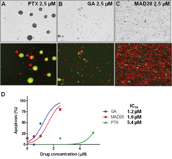 Figure 6: Dual fluorescence viability assay of treated spheroidsMARY-X. (A) Paclitaxel is ineffective at producing a ‘complete’ response by inducing apoptosis of the spheroid cells predominantly located on the outer periphery (red arrow head). (B) Gambogic acid (GA) and (C) MAD28 display ‘complete’ response as there is total dissolution of the formerly compact spheroid with well-circumscribed edges to the single cell state. (D) Dose-response curve results in comparable pattern of response (i.e. IC50 of drugs).