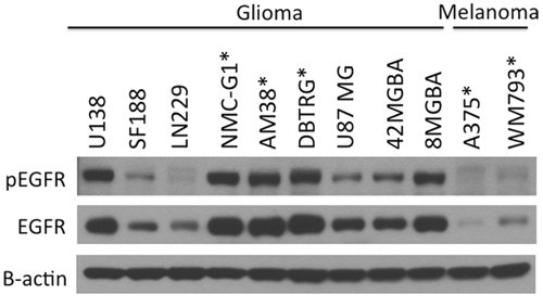 Figure 1: EGFR is highly expressed and activated in glioma cells compared to melanoma cell lines. A panel of melanoma and glioma cell lines was examined for EGFR phosphorylation and expression levels by immunoblotting. EGFR was highly activated and readily detectable in most glioma cell lines compared to melanoma cells, which has low levels of EGFR expression. Cell lines expressing BRAFV600E are marked with asterisk.