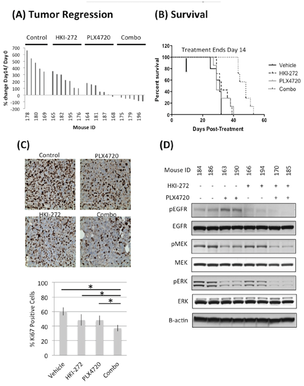 Figure 2: Combined inhibition of EGFR and BRAFV600E significantly reduces tumor growth A. and prolonged animal survival B. in a subcutaneous BT-40 xenograft model. Mice carrying subcutaneous BT-40 xenografts were treated with PLX4720 (10 mg/kg, intraperitoneal injection), HKI-272 (40 mg/kg, oral gavage) or a combination of both drugs daily for two weeks. Treatment was initiated when the tumor size reached 100 mm3. (A) Percent change in tumor volume after two weeks of daily drug treatment. The data was normalized against tumor size at Day 0 of treatment. Reduction in tumor size was observed in mice treated with a combination of PLX4720 and HKI-272, but not in the vehicle control or single drug treatment groups. (B) Survival profile of the same cohort of mice, which were euthanized due to increasing tumor burden. Mice received a combination of PLX4720 and HKI-272 had significantly extended survival compared to vehicle control (p = 8.65E-7) or single drug treatments (p value of combo vs PLX4720 = 0.0005; combo vs HKI-272 = 8.74E-6). C. Three mice from each group were euthanized 2 hours after the last day of a 3-day daily treatment. Tumors were resected and stained for Ki-67 as an indication of the cell proliferative status. Samples from the combination treatment group were significantly less proliferative compared to vehicle control (p = 0.0002) or single drug treatment groups (p value of combo vs PLX4720 = 0.0007; combo vs HKI-272 = 0.0159). D. The same tumors were also analyzed by immunoblotting to determine the extent of pathway activation. Tumors from the PLX4720 single drug treatment group showed elevated EGFR phosphorylation, whereas samples from mice treated with a combination of PLX4720 and HKI-272 has the least MEK and ERK activation levels. Phospho-Akt was undetectable in these tumors.
