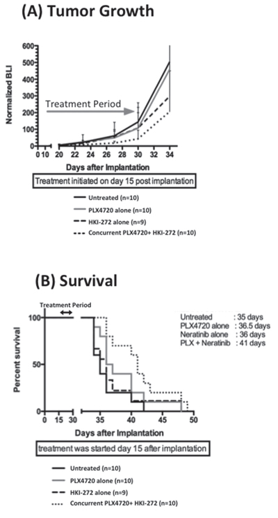 PLX4720 was provided by Plexxikon Inc (Berkeley, CA, USA) and HKI-272 (Niratinib) was purchased from TSZ Scientific LLC (MA, USA). For in vitro study, PLX4720 and HKI-272 were dissolved in dimethylsulfoxide (DMSO) at 10 mM. For administration to animal subjects, PLX4720 was dissolved in DMSO/PBS (1:1) at the concentration of 5 g/L, whereas HKI-272 was dissolved in 0.5% hydroxypropyl methylcellulose and 0.2% Tween 80 at a concentration of 8 g/L.
