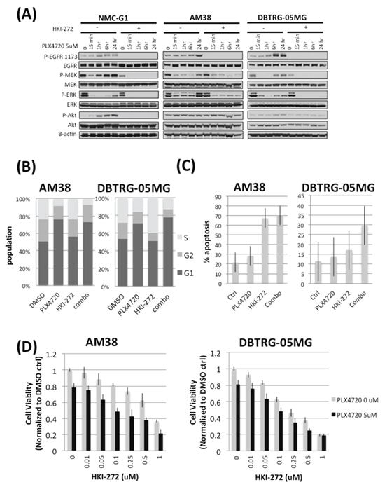 To investigate if suppression of EGFR feedback activation in PLX4720 treated cells affects cell cycle progression and viability, we treated AM38 and DBTRG-05MG cells with 5 μM PLX4720, 1 μM HKI-272, or a combination of both drugs, and measured cell cycle distributions by propidium iodine incorporation, cell viability by WST-1 assay, and apoptosis by annexin V staining. After 24 hours of drug treatment, PLX4720 induced a substantial accumulation of G1 phase cell population compared to DMSO control (DMSO vs PLX4720 treatment: AM38 p = 0.001; DBTRG-05MG p = 0.0003). Inclusion of HKI-272 with PLX4720 further increased G1 arrest in DBTRG-05MG cells (PLX4720 vs combination, p = 0.02) (Figure 4B). G1 phase cell cycle arrest was accompanied by increased apoptosis and decreased cell viability from PLX4720 + HKI-272 co-treatment. Combined treatment with PLX4720 and HKI-272 induced significant apoptosis in both AM38 and DBTRG-05MG cells, in relation to DMSO treatment (DMSO vs combination treatment in AM38, p < 0.001; in DBTRG, p = 0.046) (Figure 4C). Consistent with the apoptosis results, following 72 hours of drug exposure, PLX4720 treatment caused a significant reduction in cell viability compared to vehicle control. Cell viability was further diminished by the inclusion of HKI-272 with PLX4720 (Figure 4D). The effect of HKI-272 on PLX4720-associated cell viability was masked due to the potency of HKI-272 when used at a concentration > 0.5 μM in DBTRG-05MG cells.