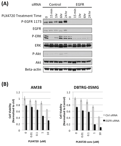 HKI-272 is an irreversible pan-HER receptor tyrosine kinase inhibitor whose use, in the context of the present study, raises the question of whether HKI-272 effects are due to the inhibition of EGFR only, or is due to combined HER family member inhibition. To address the importance of EGFR inhibition to the effects of HKI-272, we used siRNA knockdown to suppress EGFR expression in AM38 and DBTRG-05MG cells, and then examined siRNA-treated cell response to BRAFV600E pharmacologic inhibition. AM38 and DBTRG-05MG cells treated with scrambled siRNA showed a significant increase in ERK phosphorylation after 6 hours of PLX4720 treatment (Figure 5A). Increased MAPK activation, following treatment with PLX4720, was almost completely blocked by EGFR knock down (Figure 5A). A similar, albeit less pronounced effect was observed for Akt activation.