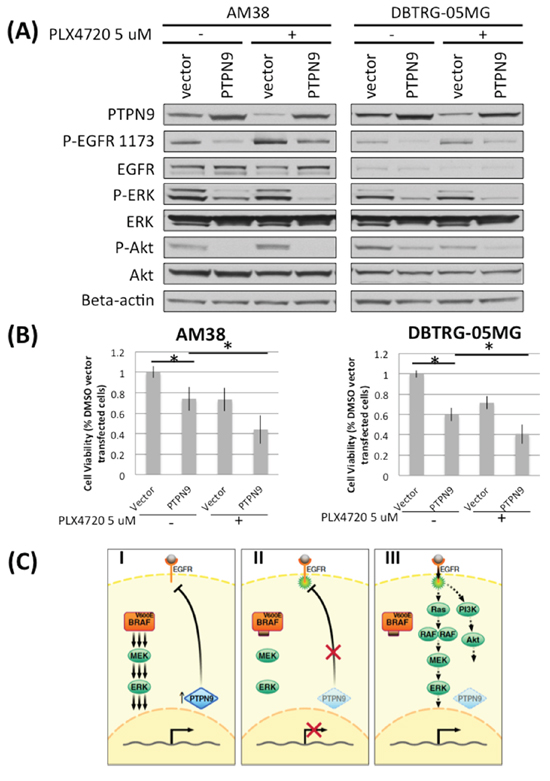Furthermore, overexpression of PTPN9 cooperates with PLX4720 to reduce cell viability. PTPN9 expression alone significantly impaired AM38 (p = 0.019) and DBTRG (p = 0.004) cell viability. The viability loss was further augmented by PLX4720 treatment (p value vector vs PTPN9 treated with PLX4720 in AM38 = 0.029; in DBTRG-05MG = 0.002). Collectively, these data support PLX4720 treatment as suppressing PTPN9 expression that, in turn, results in reduced EGFR dephosphorylation and thus enhanced EGFR activity.