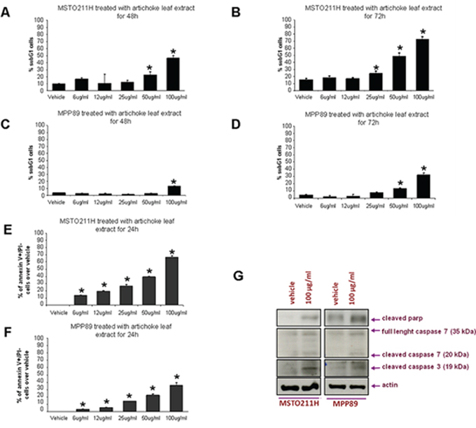 Figure 2: The artichoke leaf extract induces apoptosis of MPM cells. A, B, C, D. Percentage of subG1 cell population of MPM cells (MSTO-211H and MPP-89) treated with the indicated doses of the artichoke extract for 48 or 72 hrs. Error bars represent mean +/− SD. Statistics (t-test): p < 0.05. E, F. Histograms showing the percentage of Annexin V+/PI- over vehicle. MPM cells (MSTO-211H, MPP-89) were treated at the indicated doses of the artichoke extract for 24. Error bars represent mean +/− SD. Statistics (t-test): p < 0.05. G. Representative protein gel blot of whole cell lysates obtained from MSTO-211H and MPP-89 cell lines treated for 24 hrs with 100 μg/ml of artichoke leaf extract and stained with anti-cleaved parp, anti-caspase-3 and anti-caspase-7 antibodies. Actin staining was used as loading control.