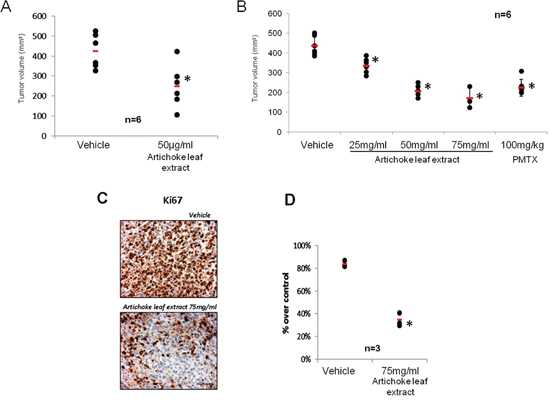 We aimed to assess in vivo the antitumoral effects of the extract. First, we evaluated whether the artichoke leaf extract could affect the engraftment of MSTO-211H cells. To this end, MSTO-211H cells were treated for 24 hrs with vehicle or artichoke extract at 50 μg/ml. Cell suspensions were subcutaneously injected into CD1 mice. As shown in Figure 4A, cells pre-treated with the extract engrafted less efficiently than vehicle-treated cells when inoculated into CD1 mice. We next evaluated the efficacy of the extract to inhibit the growth of xenografted mesotheliomas subcutaneously implanted in CD1 nude mice. To this end, CD1 mice were subcutaneously transplanted with MSTO-211H (2 × 106). At the evidence of tumor progression, mice were randomly divided in five different groups (n = 6) and were beverage with vehicle or artichoke leaf extract at different concentrations (25, 50 and 75 mg/ml) in drinking water (Table 2). Dietary feeding of the artichoke leaf extract for 3 weeks reduced significantly and dose dependent the growth of xenografted mesothelioma tumors (Figure 4B). This effect was similar to that induced by PMTX, a drug commonly employed in the treatment of mesothelioma (Figure 4B). To evaluate the proliferation index xenografted tumors were stained for Ki67 expression. Strikingly, we found that xenografted tumors derived from the extract treated mice exhibited significantly lower Ki67 expression than those treated with vehicle (Figure 4C, 4D). We also found that artichoke leaf extracts sensitized MSTO-211H and NCI-H28 mesothelioma cell lines to pemetrexed-induced cell killing (Supplementary Figure 3A-B). Similarly, artichoke leaf extract at 75 mg/ml potentiated the antitumoral effect of pemetrexed on tumor volume of xenografted tumors (Supplementary Figure 3C). Altogether these findings indicate that the artichoke leaf extract can affect in vivo the growth of mesothelioma cell lines.