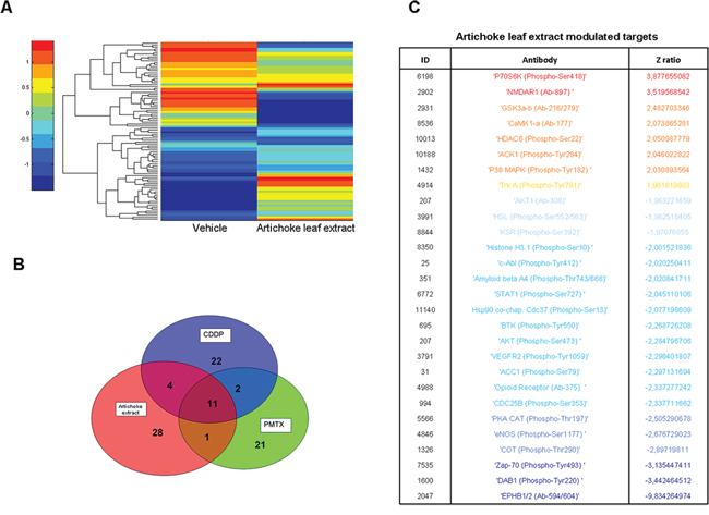 The Phospho Explorer antibody microarray, which was designed and manufactured by Full Moon Biosystems, Inc. (Sunnyvale, CA), contains 1318 antibodies [44]. Each of the antibodies has two replicates that are printed on a coated glass microscope slide, along with multiple positive and negative controls (Supplementary Figure 4). The antibody array experiment was performed using Full Moon Biosystems, according to their established protocol. In brief, cell lysates obtained from MSTO-211H treated with the artichoke extract at 50 μg/ml or with Cisplatin at 8 μM or Pemetrexed at 30 μM of concentrations for 24 hrs, were biotinylated with the antibody array assay kit (Full Moon Biosystems, Inc.). The antibody microarray slides were first blocked with a blocking solution (Full Moon Biosystems, Inc.) for 30 min at room temperature, rinsed with Milli-Q grade water for 3–5 min. The slides were then incubated with the biotin-labeled cell lysates in coupling solution (Full Moon Biosystems, Inc.) at room temperature for 2 hrs. The array slides were washed 4 to 5 times with 1x Wash Solution (Full Moon Biosystems, Inc.) and rinsed extensively with Milli-Q grade water before detection of bound biotinylated proteins using Cy3-conjugated streptavidin. Each slide (containing six replicates) hybridized and Cy3 fluorescence acquired by microarray scanner with a scan resolution of 10 mm (Agilent Technologies). The images were quantified using Agilent Feature Extraction (AFE) software (Agilent Technologies). The fluorescence signal of each antibody was obtained from the fluorescence intensity of this antibody spot after subtraction of the blank signal (spot in the absence of antibody).