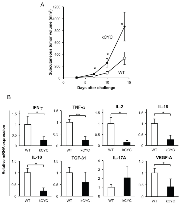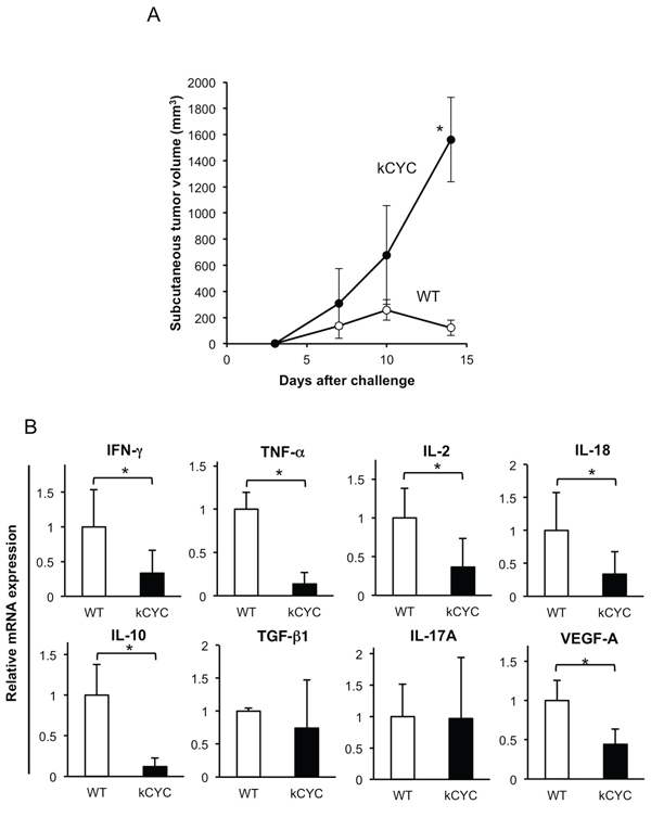 Figure 2: Primary tumor growth of EL-4 lymphoma cells is promoted, while cytokine expression in draining LNs is decreased in kCYC mice. A. Tumor volume was measured at the indicated time points following subcutaneous injection of EL-4 cells. Values represent means ± SEM (*p < 0.05). Results were obtained from 4 mice in each group. B. Cytokine mRNA expression in draining LNs from kCYC mice and wild-type (WT) mice 14 days following subcutaneous injection of EL-4 cells. mRNA expression of interferon (IFN)-γ, tumor necrosis factor (TNF)-α, interleukin (IL)-2, IL-18, IL-10, transforming growth factor (TGF)-β, IL-17A, vascular endothelial growth factor (VEGF)-A was measured by quantitative PCR. All values represent means + SEM (*p < 0.05). Results were obtained from 4 mice in each group.
