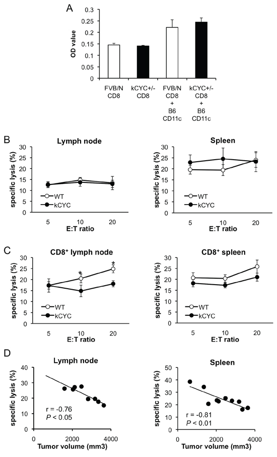 Figure 5: Cytotoxic activity of CD8+ T cells in draining LNs is decreased in kCYC mice bearing B16 melanoma cells. A. CD8+ T cells derived from kCYC+/– (FVB/N background) or wild-type FVB/N mice were co-cultured with CD11c+ cells derived from B6 mice. Proliferation of CD8+ T cells was examined with a Cell Proliferation ELISA, BrdU kit. B. Cell suspensions were prepared from draining LNs and spleen 14 days following subcutaneous injection of B16 melanoma cells. Non-purified cells were cultured with B16 melanoma cells at effector:target (E:T) ratios of 5:1, 10:1, and 20:1. Cytotoxic activity was assessed with two-color flow cytometry. All values represent means ± SEM. Results were obtained from 4 mice in each group. C. Cytotoxic responses directed against B16 melanoma by purified CD8+ LN cells or splenocytes from kCYC and wild-type (WT) mice were examined (p < 0.05). D. Correlation between tumor lytic rate at E:T ratios of 20:1 and tumor volumes were examined. The line indicates approximate curves (r = −0.76, p < 0.05, and r = −0.81, p < 0.01, respectively). Results were obtained from 8 and 10 mice, respectively.