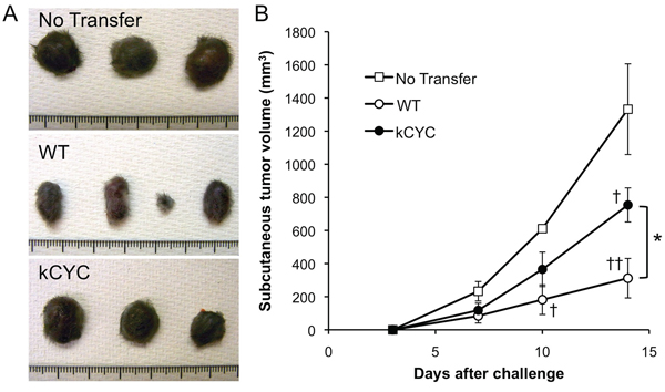 Figure 6: Tumor suppression of CD8+ T cells derived from kCYC mice is reduced when adoptively transferred to naive wild-type (WT) mice. CD8+ T cells were isolated from kCYC and WT mice that were immunized with B16 cells. B16 cells were subcutaneously injected to naive WT mice one day after the adoptive transfer of CD8+ T cells. A. Representative images of the tumor. B. Tumor volumes were measured at the indicated time points following subcutaneous injection of B16 melanoma cells. Values represent means ± SEM (*p < 0.05). †p < 0.05, ‡p < 0.01 versus control group. Experiments were performed twice using 3 to 4 mice in each group.