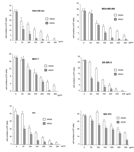 Figure 2: Anti-cancer activity of ethanol extract and chloroform fraction. Cancer cell cultures (MDA-MB-231, SK-BR-3, MDA-MB-468, MCF-7, and 4T1) and none cancer fibroblasts NIH3T3 were treated with ethanol extract (AReth) and chloroform fraction (ARchl) for 48 hours. Cell viability was analyzed. Data represent the mean ± SD of three independent experiments.