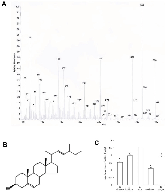Figure 3: Identification of ergosterol. A. The structure and composition of ergosterol analyzed by EI-MS. B. Structure of ergosterol based on the NMR data. C. Measurement of ergosterol concentrations from Ganoderma sinense, Ganoderma lucidum, Amauroderma rude, Coriolus versicolor, and Ganoderma tsugae.
