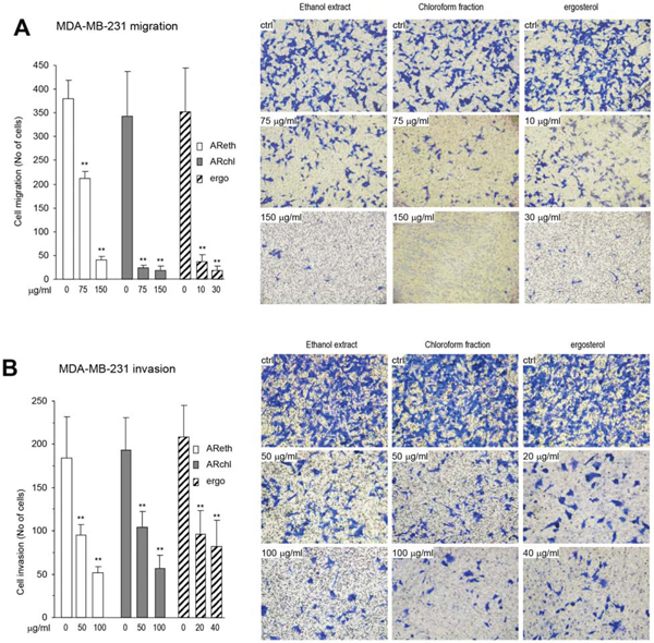 Ergosterol, the pro-vitamin D2, is a secondary metabolite of medicinal fungi, and shows a variety of biological activities including anti-inflammatory and anti-cancer effects [30]. We compared the effects of AReth, ARchl, and the purified ergosterol on cancer cell migration. In the Boyden chamber migration assay, we found that at the concentration of 75 μg/ml, both AReth and ARchl displayed an inhibitory effect on MDA-MB-231 cell migration, whereas the purified ergosterol exerted a significant inhibitory effect on cancer cell migration at the concentration of 10 μg/ml (Fig. 4A). In Matrigel invasion assay, we found that AReth and ARchl displayed inhibitory effect on MDA-MB-231 cell invasion at the concentration 50 μg/ml, whereas ergosterol exerted a significant inhibitory effect on cancer cell invasion at the concentration of 20 μg/ml (Fig. 4B).
