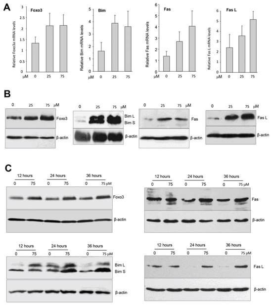 Figure 7: Ergosterol up-regulated multiple tumor suppressors. A. Total RNAs isolated from MDA-MB-231 cells treated with ergosterol for 12 hours were subject to real-time PCR to analyze expression of tumor suppressors of Foxo3, Bim, Fas, and Fas L. B. Cell lysates prepared from MDA-MB-231 cells treated with ergosterol for 20 hours were subject to Western blot analysis for expression of Foxo3, Bim, Fas, and Fas L. Ergosterol promoted expression of these tumor suppressors. C. The cells were also treated with ergosterol for different time points and analyzed for expression of Foxo3, Bim, Fas, and Fas L.