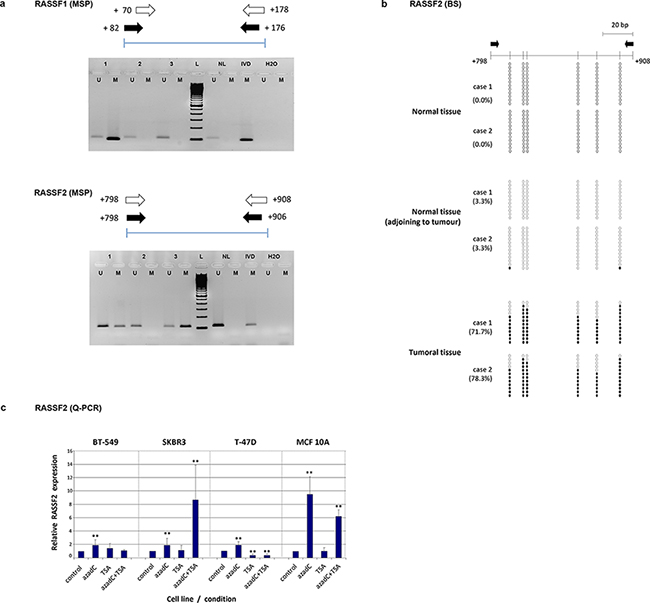 Figure 1: a. Methylation-specific PCR (MSP) for methylation analysis of RASSF1 and RASSF2 genes in tumor samples. Schemes of the region analyzed by this technique and images from different tumours including unmethylated (U) and methylated (M) cases are shown for each gene. (NL: DNA from normal lymphocytes; IVD: in vitro-methylated DNA). b. Bisulfite-sequencing analysis methylation status in 12 clones containing the RASSF2 sequence from two example cases of normal breast tissue from reduction mammoplasties, normal tissue adjacent to a tumor, and tumoral tissue. The methylation status of analyzed CpG sites is shown for each clone (open and filled circles represent unmethylated and methylated clones, respectively). Black arrows indicate the location of the MSP primers. The location of each CpG site relative to the transcription initiation site is shown by a vertical bar. c. Expression level of RASSF2 by quantitative PCR (Q-PCR) in breast cancer cell lines treated with 5-azadC and/or trichostatin. The relative level of expression was compared with the untreated cells (control), whose value was taken as 100%. Bars represent mean ± standard deviation of the relative expression level of three experiments. ** indicates very statistically significant (p < 0.01) differences in gene expression between treated and untreated cells.