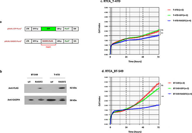 To study the effect of RASSF2 expression in breast cancer, luminal T-47D and triple-negative BT-549 cell lines were transduced using lentivectors, since these cells are the subtypes most differentiated with respect to their pathological and clinical characteristics. Expression plasmids based on pcDNA3.1/pDUAL encoding GFP (control) or RASSF2-FLAG were also constructed using previously established technology [38, 48] and purified by the Qiagen Plasmid Midi Kit. Lentivectors co-expressing the RASSF2 and puromycin resistance genes were produced by the three-plasmid cotransfection method in 293T cells, and lentivector stocks were titrated by flow cytometry or quantitative PCR, as described elsewhere [20]. Cells were transduced with lentivector stocks at a transduction multiplicity of infection of 10. Transduced cells co-expressing RASSF2 and puromycin resistance were then selected with 2 μg puromycin/ml. RASSF2 expression and RASSF2 were detected by Western Blot using FLAG-specific antibodies