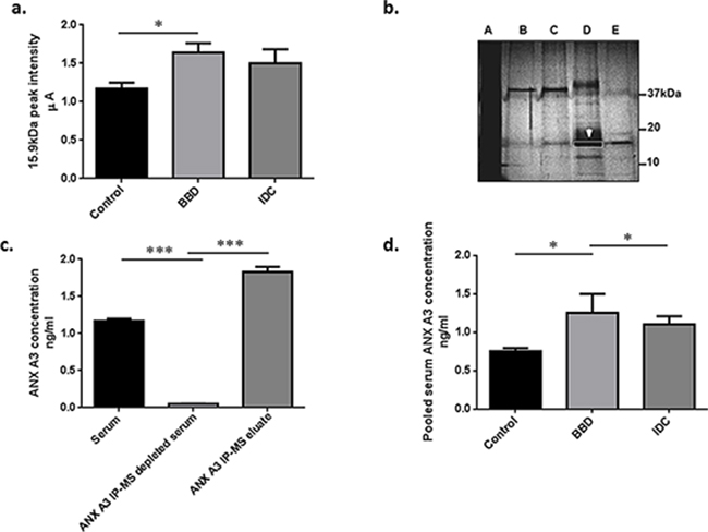 Figure 1: Bottom up proteomic analysis identified ANX A3 as a potential breast cancer marker. a. Semi-quantitative MS expression profiling analysis was performed on serum samples in two centres (UoS and SGUL). Bars represent mean peak intensity ± standard error (SE) for the 15.9 kDa putative peak marker detected by MS analysis. Significant biomarker up-regulation in the benign disease group compared to controls and non-significant higher levels as compared to cancer sera fractions were illustrated. (Mann-Whitney U test *P < 0.05) b. Unfractionated serum (A), a series of different consecutively pooled and vacuum dried FFE fractions (B–E) were run on 1D-GE (4% tricine/10% SDS/16% polyacrylamide) gel at 100 V for 4 h at room temperature to purify the candidate BBD biomarker at 15.9 kDa. This approach was used to increase the biomarker concentration and reduce sample complexity. The dominant 15.9 kDa protein band (white arrow/box) was identified by infusion FT-Orbitrap MS2 and Ion-trap LC MS2 as ANX A3. c. IP-MS verification of the 15.9 kDa marker identified as ANX A3. Antibody capture of ANX A3 was performed using monoclonal antibody (sc-134260, Santa Cruz). The antibody was linked to μMACS protein A/G columns (Miltenyi Biotec) and incubated with pooled serum fractions containing ANX A3. The bars illustrate MS profiles of ANX A3 expression in serum fraction, along depleted specimen and the enriched ANX A3 IP eluate respectively. The depletion of ANX A3 in the IP MS samples and subsequent enrichment in the eluate spectra confirmed the identity of the 15.9 kDa peak as ANX A3. d. ANX A3 levels in pooled serum fractions measured by quantitative ELISA. ANX A3 over expression in control (n = 5) compared to both benign disease (n = 4) and invasive breast cancer (n = 5) groups was illustrated in this independent validation cohort. Bars represent the mean ANX A3 levels ± standard error (SE). *P < 0.05.