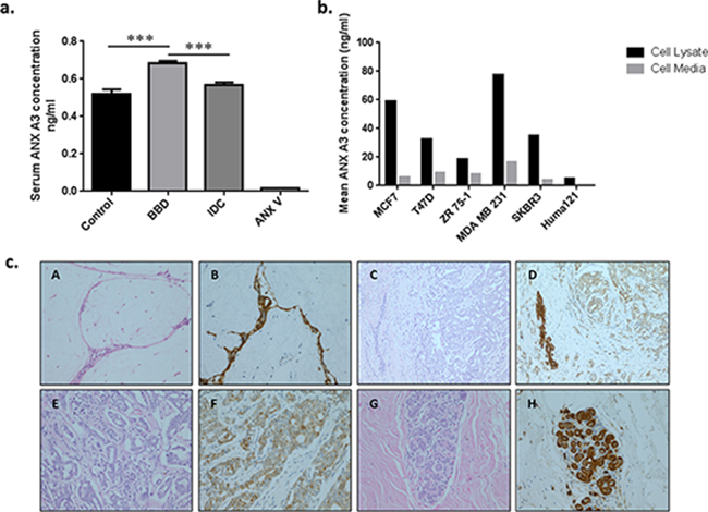 Figure 2: Immuno-validation and tissue correlation of ANX A3. a. ANX A3 levels in pooled serum fractions measured by quantitative ELISA. ANX A3 over expression in benign disease (n = 21) compared to both control (n = 14) and invasive breast cancer (n = 16) groups was illustrated in this independent validation cohort. Bars represent the mean ANX A3 levels ± standard error (SE). The ANX A3 ELISA kit detection specificity was assessed using ANX V recombinant protein as a negative control. Here, serum ANX A3 was significantly over expressed in the BBD compared to the control and IDC groups. ***P < 0.0005. b. Annexin A3 levels in the cell lysates (black bars) and culture medium (white bars) from six neoplastic human breast cell lines were measured by ELISA. ANX A3 expression was confirmed by ELISA in malignant cell lines (MCF7, ZR 75–1. T47D, SKBR3, MDA MB231) and conditioned media. A lower ANX A3 expression was detected in the non-malignant Huma121 cells and conditioned media. c. Representative photomicrographs of Annexin A3 immunohistochemistry in paired breast tissue corresponding to serum samples used in the MS analysis. A and B represent fibroadenoma (original magnification x200) with strong epithelial ANX A3 staining (B) C and D represent invasive carcinoma (x200) where the tumour is surrounding a benign duct. The tumour shows weak tumour ANX A3 expression compared to the benign area. E and F High power (x400) images of invasive ductal carcinoma showing weak annexin expression. G and H normal breast lobule demonstrating annexin expression. Overall, the BBD tissue ANX A3 staining was significantly higher than the other groups (P < 0.05).