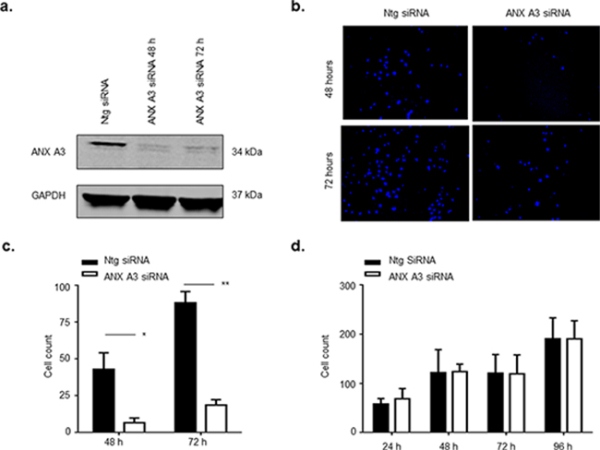 Figure 3: ANX A3 silencing inhibits migration of MCF7 cells. MCF7 cells were transfected with 10 nM ANX A3-siRNA using Oligofectamine™ (Invitrogen) as per manufacturer’s instructions. a. At indicated time points cell lysates were assessed by immunoblotting for ANX A3 and GAPDH as a loading control. The signal was analysed using a LICOR Odyssey imaging system. ANX3 was successfully silenced for the duration of the experiment. b. ANX A3 was silenced in MCF7 cells and cells were seeded onto the upper layer of the transwell cell permeable membrane transwell. At indicated time points cells were fixed, cells on the upper layer of the transwell membrane were removed whereas cells that had migrated to the underside of the transwell membrane were stained with DAPI stain and counted. ANX A3 visibly reduced the number of cells that migrated to the underside of the transwell membrane. c. Quantification of migration showed that migration was significantly reduced in ANX A3-silenced cells at both 48 h (*p < 0.01, n = 3) and 72 h (*P < 0.001, n = 3). d. 5000 cells were seeded into wells of 24 well plates, fixed at indicated time points and stained with DAPI central fields of view were images and cells counted. No difference in proliferation was observed between ANX A3silenced cells and control cells treated with ntg-siRNA (n = 3).