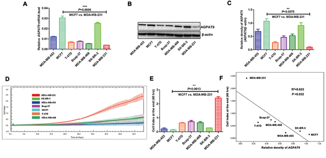 Figure 1: Association between AGPAT9 expression and tumor invasion. The expression levels of AGPAT9 in various breast cancer cell lines were determined by quantitative real-time PCR A. and Western Blotting B. C. Relative density analysis of the AGPAT9 protein bands. The relative density is expressed as the ratio AGPAT9/β-actin. D. Real time invasion analysis of seven breast cancer cell lines. The methods were described in MATERIALS & METHODS. Invasion was monitored for 48 h in the xCELLigence DP system. The cell index was measured every 15 minutes. The rate of change of cell index as a function of time was calculated as a measure of invasive activity. E. The cell index at the end (48 hrs) is shown as a bar chart. F. Association between AGPAT9 expression and tumor invasion in seven breast cancer cell lines.