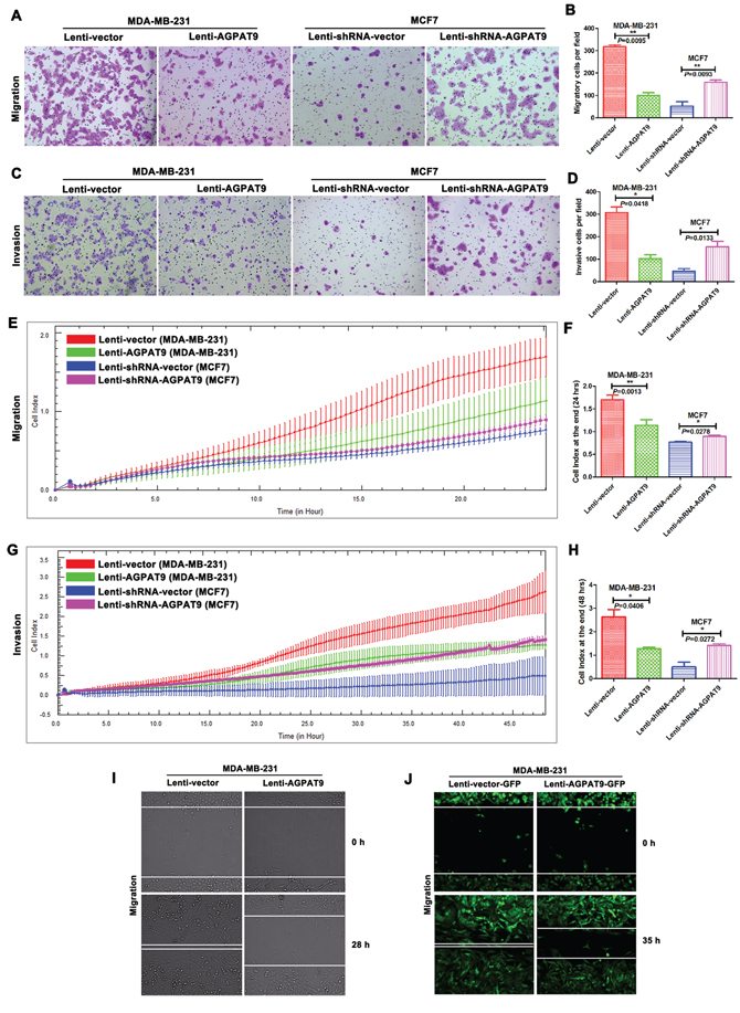 Figure 3: AGPAT9 inhibited breast cancer cell migration and invasion. Transwell assays showed that overexpression of AGPAT9 inhibited the migration A, B. and invasion C, D. rate of MDA-MB-231 cells, and knockdown of AGPAT9 enhanced the migration (A, B) and invasion (C, D) rate of MCF7 cells. Migration E. or invasion G. was monitored for 24 h or 48 h in the xCELLigence DP system. The cell index was measured every 15 minutes. The rate of change of cell index as a function of time was calculated as a measure of migration or invasion activity. The cell index at the end (24 hrs or 48 hrs) is shown as a bar chart F, H. The migration of cells into the wound was monitored in multiple wells using a CellVoyager CV1000 confocal scanner system. The images were acquired every 0.5 hour for 28 hours (see Supplementary Movies S1 and S2) or 35 hours (see Supplementary Movies S3 and S4). The images shown represent 0 hour and 28 hours I. The distance between the two edges of the scratch in the Lenti-AGPAT9 well was obviously greater than that of the control. The images shown represent 0 hour and 35 hours J. The distance between the two edges of the scratch in the Lenti-AGPAT9-GFP well was obviously greater than that of the control. *P < 0.05; **P < 0.01.