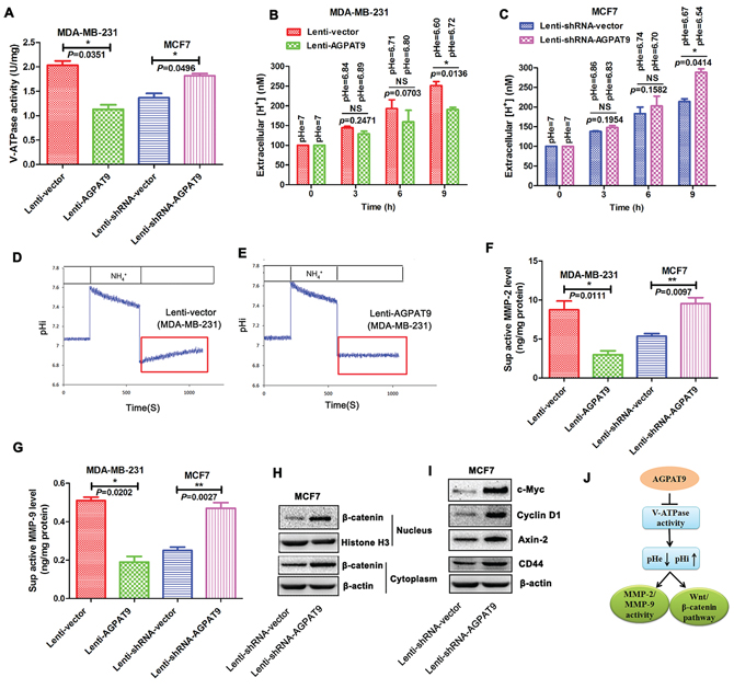 Figure 5: Effect of AGPAT9 on the V-ATPase activity, MMP-2 activity, MMP-9 activity and Wnt/β-catenin pathway. A. Activity of V-ATPase in Lenti-AGPAT9 and Lenti-shRNA-AGPAT9 cells. B. Proton secretion was decreased in the Lenti-AGPAT9 cells compared with the Lenti-vector. C. Proton secretion was increased in the Lenti-shRNA-AGPAT9 cells compared with the Lenti-shRNA-vector. D, E. pHi recovery analysis. The cells were pulsed with 40 mmol/NH4Cl and acid loaded by exposure to a Na+ and NH4+-free solution. The pHi in Lenti-vector cells (D) recovered from the acid load. Lenti-AGPAT9 (E) did not recover to the baseline (indicated in red). The resting pHi in Lenti-AGPAT9 cells decreased compared with Lenti-vector cells because of the defect of V-ATPase activity in Lenti-AGPAT9 cells. Active MMP-2 F. and active MMP-9 G. levels in culture supernatants were measured using the enzyme-linked immunosorbent assay (ELISA). Reduced expression of AGPAT9 in MCF7 cells could result in an obvious increase in β-catenin protein level in both nucleus and cytoplasm compared to control H. The expression of Wnt/β-catenin pathway target genes, c-Myc, Cyclin D1, Axin-2 and CD44 were significantly increased in the Lenti-shRNA-AGPAT9 (MCF7) cells when compared with control cells I. J. Schematic diagram. *P < 0.05; **P < 0.01.