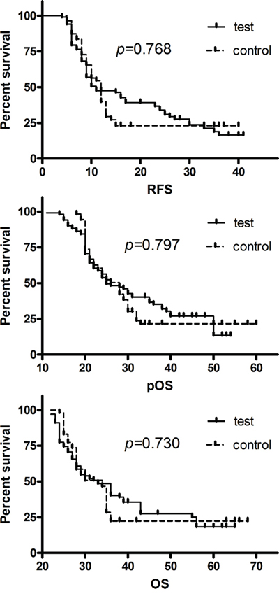 At the end of follow-up (December 2013), 72 (70.6%) patients in the test group and 40 (72.7%) patients in the control group had died. The median follow-up for these patients was 34.6 ± 11.8 months (range, 22–68) and the total follow-up time after initial therapy was more than 5 years. The causes of death are listed in Table 2.