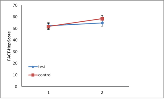 Figure 3: Quality-of-life assessments according to the 18-item hepatobiliary cancer subscale (HepCS) in functional assessment of cancer therapy-hepatobiliary (FACT-Hep). Dots and error bars indicate the mean total scores and 95% CI, respectively. Higher scores indicate a better quality of life. 1, one month after administration of sorafenib; 2, two months after the complete response.