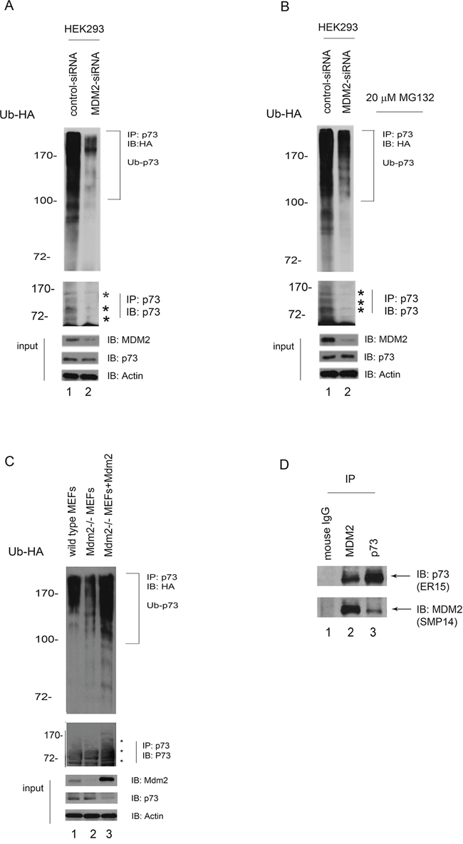 Figure 2: MDM2 is required for p73 ubiquitination in vivo. A. HEK293 cells were transfected with MDM2-siRNA or control-siRNA constructs. Forty hours later, the cells were further transfected with a plasmid expressing HA-Ub. Lysates were immunoprecipitated with a p73specific antibody (ER-15) and analyzed by western blotting with an HA-specific antibody to detect ubiquitinated p73. The western blots for p73, MDM2, and actin are shown in the lower panel. B. The same procedure as (A) was used, except that after the second transfection with the HA-Ub expression plasmid, the cells were treated with the proteasome inhibitor MG132 (20 μM) 6 hr prior to harvest. C. Similar to (A) except that the cell extracts were obtained from the wild-type mouse embryonic fibroblasts (MEFs) and Mdm2 null MEFs. In addition, Mdm2 expression plasmid was reintroduced into Mdm2 null MEFs (lane 3). D. HEK293 cells were immunoprecipitated with anti-p73 (ER-15) or anti-MDM2 (SMP14) as indicated, and immunoblotted with antip73 (upper image, ER-15) and anti-MDM2 antibodies (lower image).