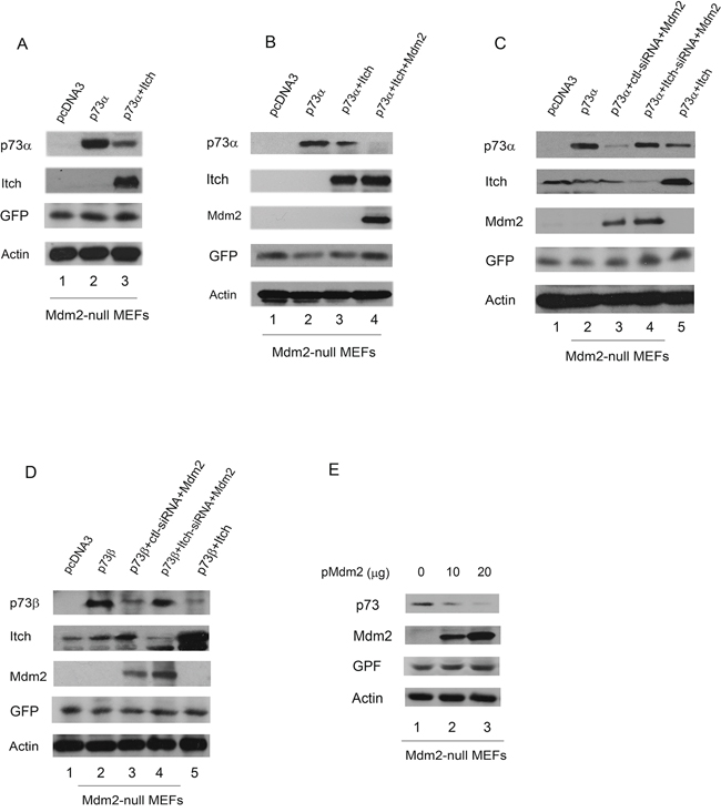 Figure 4: Overexpression of Mdm2 promotes p73 degradation in Mdm2-null MEFs. A. Mdm2 null MEFs were transfected with plasmids expressing p73α or an empty vector with Myc-tagged Itch, along with a GFP expressing plasmid (pEGFP) and analyzed by western blotting with a p73-specific antibody (H-79), a Myc-specific antibody for Myc-Itch, a GFP-specific antibody (B-2), and actin as a loading control. B. The same procedure as (A) was used, except that Mdm2 null MEFs were cotransfected with plasmids expressing GFP, p73α along with Itch and Mdm2. C. and D. Mdm2-null MEFs were transfected with an Itch-specific siRNA or a control siRNA. Thirty hours later, the cells were transfected with plasmids expressing GFP, Mdm2 and analyzed by western blot using anti-p73, anti-Itch, anti-p53 (Pab421), anti-GFP (B-2), and anti-Mdm2 (MD-219) antibodies as indicated. E. Mdm2-null MEFs were transfected with plasmids expressing GFP and increased amounts of Mdm2 and analyzed by western blotting with p73-specific (H-79), GFP-specific (B-2) and Mdm2-specific (MD-219) antibodies.