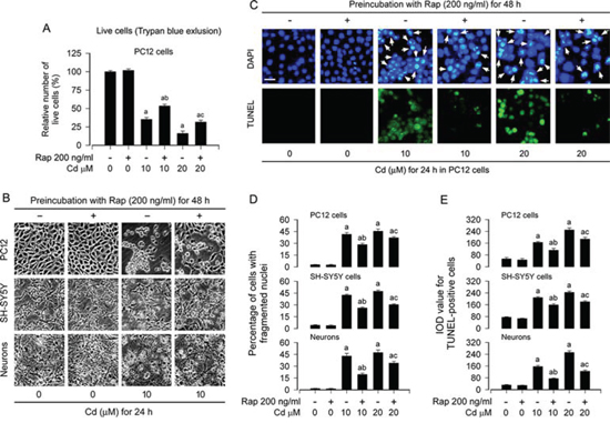 Figure 1: Rapamycin attenuates Cd-induced apoptotic cell death in neuronal cells. PC12 cells, SH-SY5Y cells and primary neurons were pretreated with rapamycin (Rap, 200 ng/ml) for 48 h, and then exposed to Cd (10 and/or 20 μM) for 24 h. A. Live cells were detected by counting viable cells using trypan blue exclusion. B. Cell morphological changes were visualized under an Olympus inverted phase-contrast microscope (200 ×) equipped with Quick Imaging system. Scale bar: 50 μm. C. Apoptotic cells were evaluated by nuclear fragmentation and condensation (arrows) using DAPI staining (upper panel) and concurrently by in situ detection of fragmented DNA (in green) using TUNEL staining (lower panel). Scale bar: 20 μm. D and E. The percentages of cells with fragmented nuclei (D) and the number of TUNEL-positive cells (E) were quantified, showing that rapamycin dramatically attenuated Cd-induced apoptosis in PC12 cells, SH-SY5Y cells and primary neurons. For (A), (D), and (E), all data were expressed as means ± SE (n = 5). aP < 0.05, difference with control group; bP < 0.05, difference with 10 μM Cd group; cP < 0.05, difference with 20 μM Cd group.