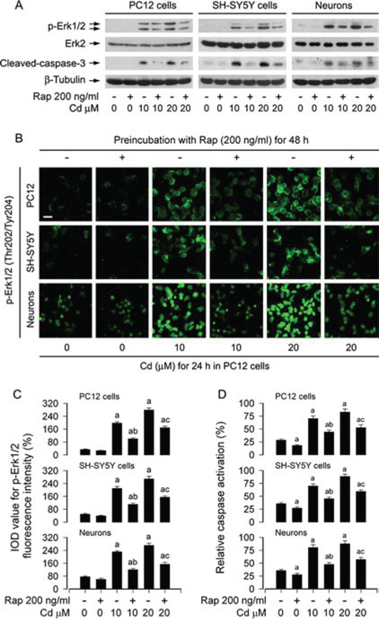 Figure 2: Rapamycin inhibits Cd-induced activation of Erk1/2 and caspases in neuronal cells. PC12 cells, SH-SY5Y cells and primary neurons were pretreated with rapamycin (Rap, 200 ng/ml) for 48 h, and then exposed to Cd (10 and 20 μM) for 4 h (for Western blotting) or 24 h (for immunofluorescence staining and caspase-3/7 activity assay). A. Total cell lysates were subjected to Western blotting using indicated antibodies. B and C. Expression of p-Erk1/2 (Thr202/Tyr204) is imaged using immunofluorescence staining, showing that treatment of the cells with Cd for 24 h resulted in higher p-Erk1/2 expression (in green), which was obviously attenuated by rapamycin. Scale bar: 20 μm. D. Caspase-3/7 activity was determined using Caspase-3/7 Assay Kit, showing that rapamycin substantially blocked Cd activation of caspases 3/7 in the cells. For (A), the blots were probed for β-tubulin as a loading control. Similar results were observed in at least three independent experiments. For (C) and (D), all data were expressed as means ± SE (n = 5). aP < 0.05, difference with control group; bP < 0.05, difference with 10 μM Cd group; cP < 0.05, difference with 20 μM Cd group.
