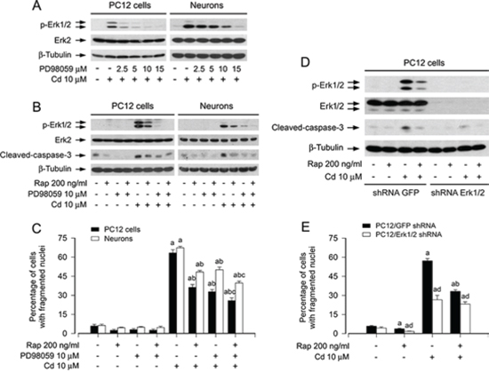 Figure 3: Pharmacological inhibition of Erk1/2 with PD98059 or down-regulation of Erk1/2 strengthens rapamycin’s prevention of Cd-induced apoptosis in neuronal cells. PC12 cells and primary neurons, or PC12 cells infected with lentiviral shRNA to Erk1/2 or GFP (as control), respectively, were pretreated with/without PD98059 (2.5–15 μM) for 1 h, pretreated with/without rapamycin (Rap, 200 ng/ml) for 48 h and then with/without PD98059 (10 μM) for 1 h, or pretreated with/without Rap for 48 h, followed by exposure to Cd (10 μM) for 4 h (for Western blotting) or 24 h (for live cell assay and cell apoptosis analysis). A, B and D. Total cell lysates were subjected to Western blotting using indicated antibodies. C and E. Apoptotic cells were evaluated by nuclear fragmentation and condensation using DAPI staining. For (A), (B), and (D), the blots were probed for β-tubulin as a loading control. Similar results were observed in at least three independent experiments. For (C) and (E), all data were expressed as means ± SE (n = 5). aP < 0.05, difference with control group; bP < 0.05, difference with 10 μM Cd group; cP < 0.05, difference with Cd/Rap group or Cd/PD98059 group. dP < 0.05, Erk1/2 shRNA group versus GFP shRNA group.
