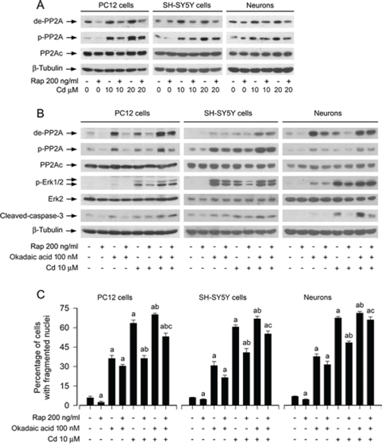 Figure 4: Rapamycin inhibits Cd-induced activation of Erk1/2 and apoptosis partially by preventing Cd from inactivating PP2A in neuronal cells. PC12 cells, SH-SY5Y cells and primary neurons were pretreated with/without rapamycin (Rap, 200 ng/ml) for 48 h and then with/without okadaic acid (100 nM) for 1 h, followed by exposure to Cd (10 and/or 20 μM) for 4 h (for Western blotting) or 24 h (for cell apoptosis analysis). A and B. Total cell lysates were subjected to Western blotting using indicated antibodies, showing that rapamycin prevented Cd inactivation of PP2A (A). and pharmacological inhibition of PP2A with okadaic acid confered resistance to rapamycin’s inhibition of Cd-induced PP2A inactivation, Erk1/2 phosphorylation in neuronal cells (B). C. Apoptotic cells were evaluated by nuclear fragmentation and condensation using DAPI staining. For (A) and (B), the blots were probed for β-tubulin as a loading control. Similar results were observed in at least three independent experiments. For (C), all data were expressed as means ± SE (n = 5). aP < 0.05, difference with control group; bP < 0.05, difference with 10 μM Cd group; cP < 0.05, difference with Cd/Rap group or Cd/okadaic acid group.