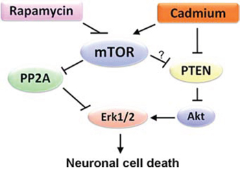 Here we show that rapamycin inhibits Cd-induced neuronal cell death in part by suppressing Erk1/2 pathway. Mechanistically, rapamycin blocks Cd activation of Erk1/2, not only by preventing Cd inhibition of PP2A, but also via blocking Cd down-regulation of PTEN and activation of Akt in neuronal cells in an mTOR kinase activity-dependent manner. Our findings underline a potential beneficial role of rapamycin in the prevention and/or treatment of Cd-induced neurodegenerative disorders.