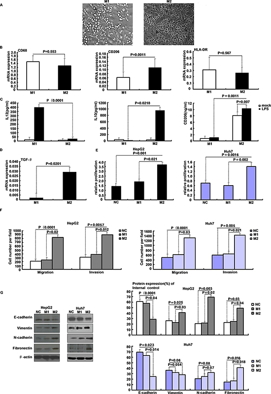 Figure 1: Features of M1 and M2 polarized macrophages in culture. A. Phase contrast microscopy of M1 and M2 macrophages cultures after one week in presence of GM-CSF (800 IU/ml) or M-CSF (100 ng/ml), respectively. B. mRNA expression of CD68, CD206 and HLA-DR in M1/M2 macrophages quantified by qRT-PCR. C. IL-12, IL-10 and CD206 concentrations in cell culture medium of M1/M2 macrophages after LPS stimulation for 3 h were determined by ELISA. D. TGF-β expression in M1/M2 macrophages was determined by qRT-PCR. E. Proliferation of HepG2 and Huh7 cells in the presence of M1/M2 macrophages conditioned media. F. Migratory and invasive abilities of HepG2 and Huh7 cells in macrophages supernatant as evaluated by the transwell assay. G. Western blot analysis of EMT-related proteins levels after M2 supernatants transfected in HepG2 and Huh7 cells.