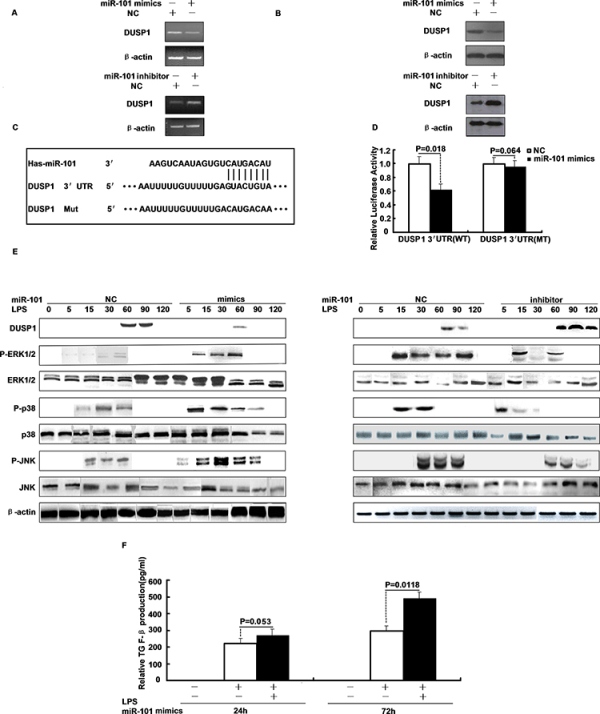 Figure 2: DUSP1 is a direct target of miR-101 and miR-101 regulates the LPS-induced activation of p38 and JNK. A. The mRNA and B. protein levels of DUSP1 were determined in M2 cells were transfected with miR-101 mimics, inhibitor or respective controls. C. The putative human DUSP1 3′-UTR fragment containing wild-type or mutant miR-101-binding sequence was inserted into a plasmid downstream of the luciferase reporter gene. D. Dual-luciferase assay of 293T cells co-transfected with the firefly luciferase constructs containing the DUSP1 WT or Mut 3′-UTR as well as miR-101 mimics or negative control. E. M2 cells were transfected with miR-101 mimics, inhibitor or respective controls and then stimulated with LPS for different time periods, Western blot analysis of DUSP1, ERK1/2, p38 and JNK protein expression. F. ELISA analysis of TGF-β level after M2 cells were transfected with miR-101 mimics or NC and then stimulated with LPS.