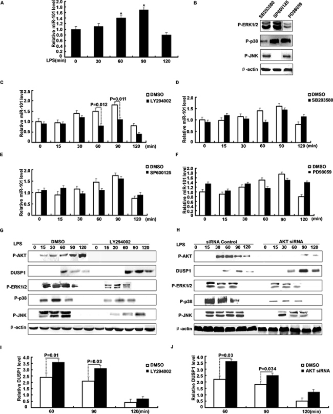 Figure 3: PI3K/AKT pathway regulates the induction of miR-101 by LPS. A. M2 cells were stimulated with LPS and miR-101 expression was determined by qRT-PCR. B. Western blot analysis of protein level after M2 cells were pretreated with inhibitors and then stimulated with LPS. C–F. miR-101 mRNA levels were determined after M2 cells were pretreated with (C) LY294002, (D) SB203580, (E) SP600125, or (F) PD98059 and then stimulated with LPS for different time periods as indicated. G. M2 cells were pretreated with PI3K/AKT inhibitor, H. transfected with AKT siRNA or NC and then stimulated with LPS for the indicated time periods, Western blot analysis of DUSP1, ERK1/2, p38, JNK protein expression. I–J. Densitometric analysis of DUSP1 protein expression as G or H.