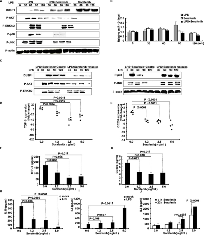 Sorafenib is one of the most effective anti-cancer drugs that inhibit activation of MAPKs. To examine whether sorafenib alters miR-101, M2 cells were treated with LPS, LPS plus sorafenib, or sorafenib only for different time periods. After LPS stimulation, treatment sorafenib markedly increased DUSP1 expression and attenuated activation of ERK1/2, p38 and JNK (Figure 4A). Also, treatment with sorafenib inhibited LPS-stimulated activation of PI3K/AKT and the LPS-induced expression of miR-101(Figure 4B). So, up-regulation of DUSP1 by sorafenib may correlate with down-regulation of miR-101 due to AKT inhibition. We then measured the effect of miR-101 mimics on the up-regulation of DUSP1 by sorafenib in LPS-stimulated M2 cells. Figure 4C indicates that treatment with miR-101 mimics and sorafenib inhibited induction of DUSP1 in LPS-stimulated M2 cells. Therefore, part of the anti-inflammatory effect of sorafenib may occur through inhibition of LPS-induced activation of PI3K/AKT, reducing miR-101 expression and subsequent induction of DUSP1 to deactivate MAPKs. Treatment of M2 macrophages with increasing sorafenib concentrations decreased TGF-β and CD206 mRNA expression (Figure 4D–4E). In line with mRNA expression data, TGF-β and CD206 protein was suppressed in M2 macrophage culture-derived media by sorafenib (Figure 4F–4G). The decrease in CD206 also indicated a reversion of alternative macrophage polarization, particularly because LPS-stimulated IL-10 secretion (Figure 4H) by M2 macrophages was reduced in favor of a classical IL-6 response after addition of sorafenib in a dose-and time-dependent fashion (Figure 4I–4J). However, M1 macrophages did undergo cytokine induction and macrophage morphology did not change during sorafenib treatment.