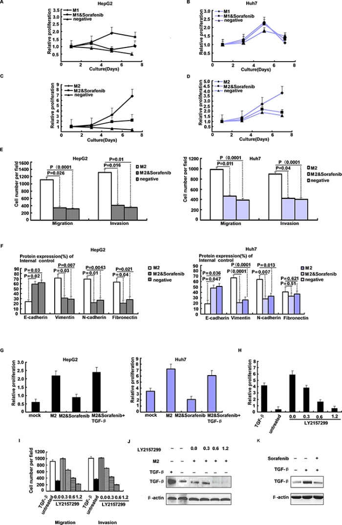 Figure 5: Macrophage secreted TGF-β drives HCC progression. A–D. Proliferation of HepG2 and Huh7 cells in presence of conditioned media derived from sorafenib-treated (5 ug/ml, 24 h) or treated M1/M2 macrophages by CCK-8 assay. E. Migratory and invasive abilities of HepG2 and Huh7 cells evaluated by the transwell assay after treatment with sorafenib in M2 supernatant. F. Densitometric analysis of EMT-related proteins levels after HepG2 and Huh7 cells treated with M2 supernatant and sorafenib. G. HepG2 and Huh7 cells growth after supplementation of TGF-β (100 ng/ml) to media derived from M2 macrophage cultures treated with sorafenib (5 ug/ml, 24 h). H. Proliferation of HepG2 cells in presence of M2 macrophage conditioned media or unconditioned controls, and TGF-β or inhibitor LY2157299 were added as indicated. I. Migration and invasion of HepG2 cells in presence of M2 macrophage conditioned media or unconditioned controls, and TGF-β or inhibitor LY2157299 were added as indicated. J. Western blot of TGF-β expression in HepG2 derived from experiment. K. Western blot of TGF-β expression in HepG2 of 24 h serum-derived HepG2 cultures, treated with sorafenib (5 ug/ml, 3 h) followed by stimulation with TGF-β (100 ng/ml, 3 h) as indicated.