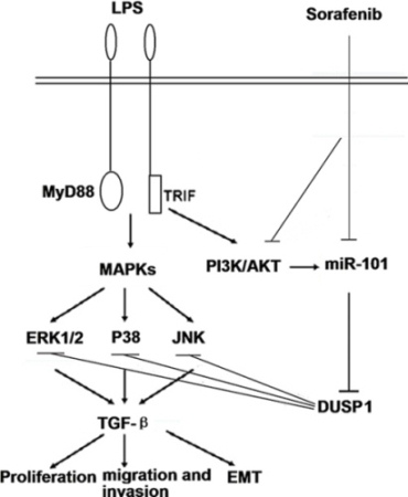 In summary, sorafenib alters the function of M2-polarized TAMs and reduces TGF-β-driven HCC progression. miR-101 directly targets DUSP1 to regulate MAPKs activation and subsequent cytokine production in response to LPS stimulation (Figure 8). These data suggest a complexity of signal transduction pathways involved innate immune responses to sorafenib.