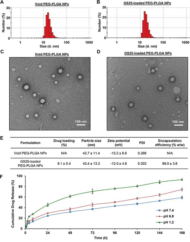 Figure 1: Preparation and characterization of PEG-PLGA nanoparticles. The size and size distribution of the A. void and B. GS25-loaded PEG-PLGA NPs determined by dynamic light scattering. The morphology of the C. void and D. GS25-loaded PEG-PLGA NPs examined by transmission electron microscopy. E. The characteristics of the void and GS25-loaded PEG-PLGA NPs. PDI, polydispersity. F. The cumulative release kinetics of GS25 from GS25NP in simulated gastric fluid (pH 1.2), simulated intestinal fluid (pH 6.8) without enzymes and PBS (pH 7.4). The concentration unit for GS25NP is GS25 equivalent in all experiments and all experiments were repeated three times.