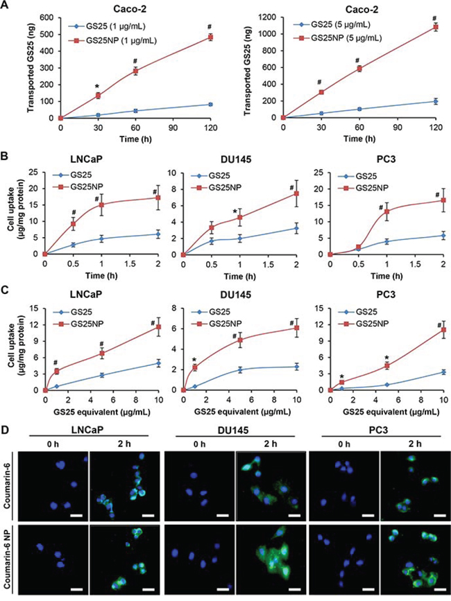Figure 2: In vitro permeability and cellular uptake of GS25 and GS25NP. A. The permeation of 1 and 5 μg/mL of free GS25 and GS25NP from apical to basolateral across Caco-2 cell monolayers at 37°C, presented as the amount of GS25 transported. B, C. The cellular uptake of GS25 and GS25NP in prostate cancer cells. Cells were treated with B 10 μg/mL of GS25 or GS25NP for 2 h or C 1, 5 or 10 μg/mL of GS25 or GS25NP for 1 h. GS25 was extracted and quantified by a LC-MS/MS analysis and normalized to the protein content. D. Cells were incubated with free coumarin-6 or coumarin-6-loaded NPs for 2 h, then the cellular uptake was monitored by a fluorescence microscope (scale bar, 20 μm). The concentration unit for GS25NP is GS25 equivalent in all experiments and all experiments were repeated three times. (*P < 0.05 and #P < 0.01).